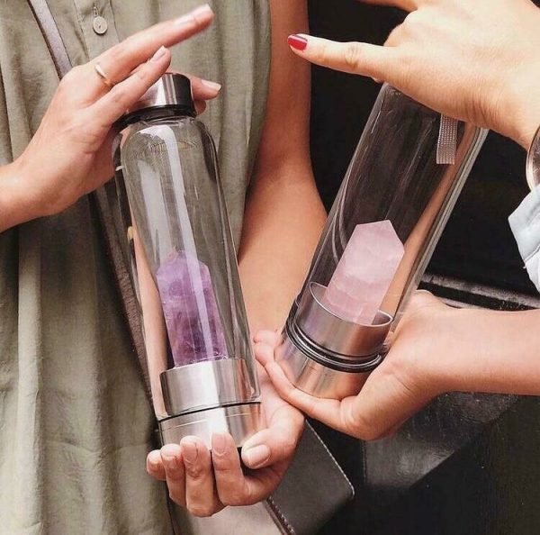 Botella de cristal con punta biterminada calidad superior de Gema de Amatista, Cuarzo Rosa o Obsidiana Negra para infusionar agua.